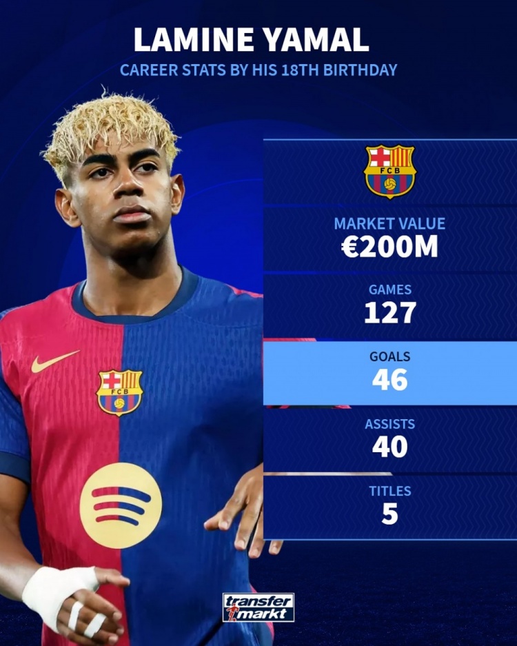 7月13日讯 今日是巴萨天才亚马尔18岁生日,德转对比了亚马尔与梅西、C罗和内马尔四人18岁时的具体数据,其中亚马尔的成就对比三位前辈都是断层领先。