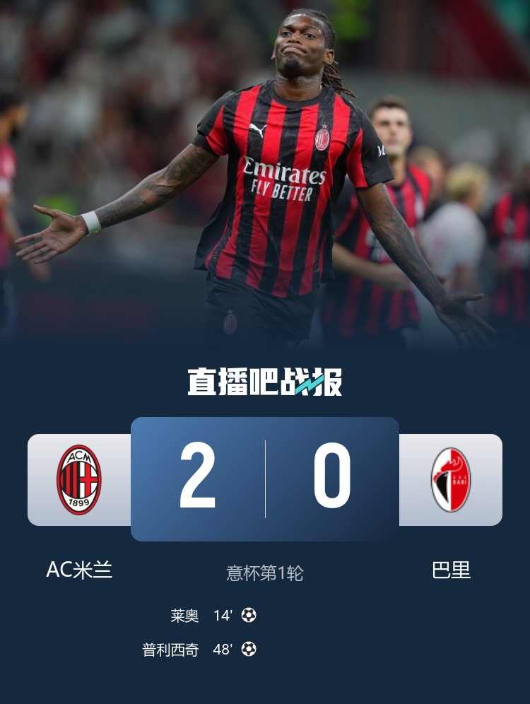 意大利杯第1轮,AC米兰2-0战胜巴里,莱奥、普利西奇破门,莫德里奇上演正赛首秀。